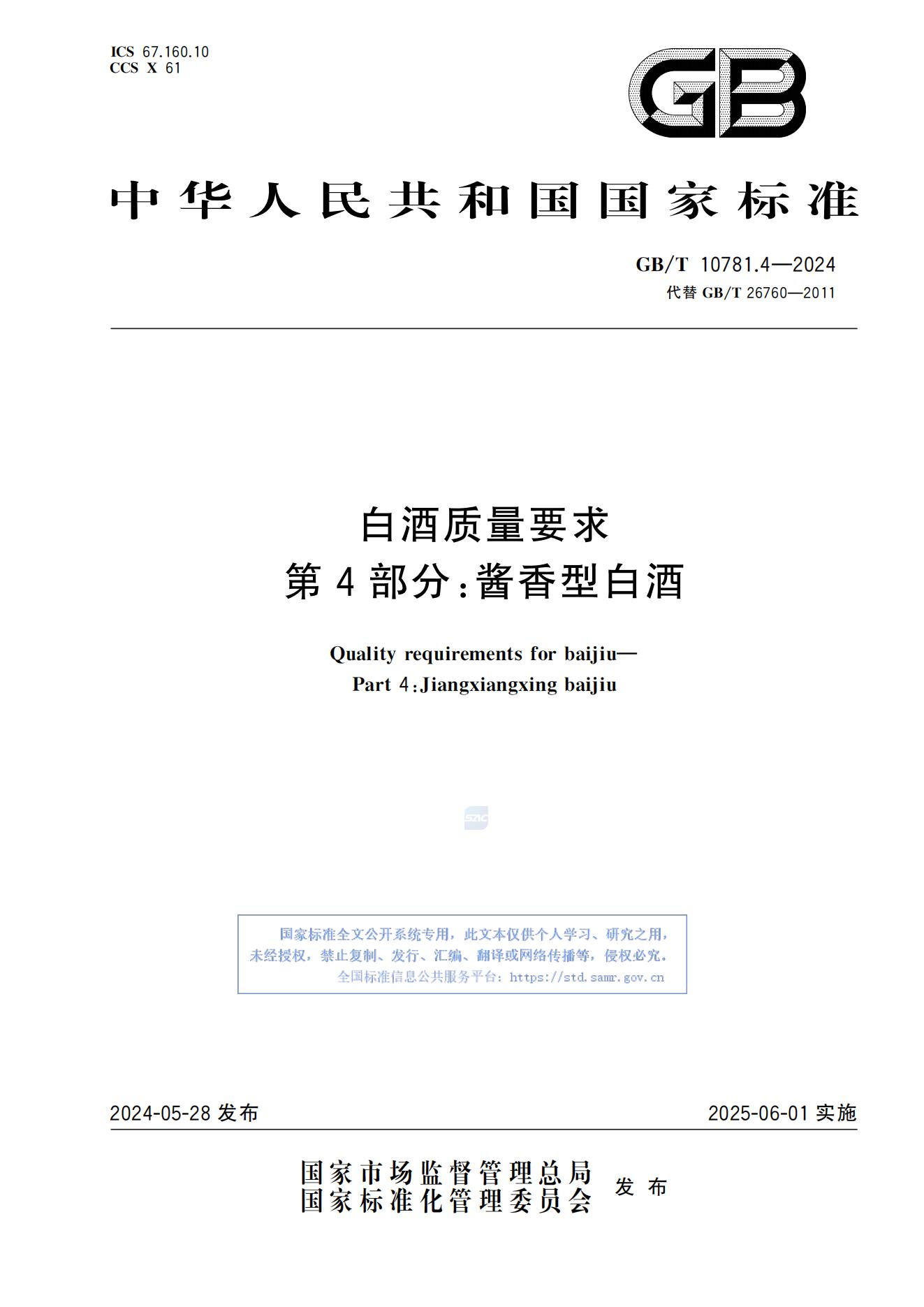 白酒質(zhì)量要求 第4部分:醬香型白酒 GB/T 10781.4—2024代替GB/T 26760—2011